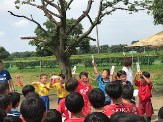 強豪が揃いの大会の中で、広いグラウンドの中でどれだけ首を振って周りの状況が確認できるか、一つ一つ確認をするよい機会となりました。前を向く前に首を振って、人がいない方へターンをすること、相手を食いつかせてからアクションを起こすことを伝え送り出しましたが、相手のDFの速さが異なるとターンスピードやアクションにも変化を出さないとボールをロストすることもわかったよね。はるきやしょうたはターンの方向をよく意識していたし、こうきやりとは食いつかせてからのアクションを必死でチャレンジしていましたね。ある試合でセンターバックが左足を使って出したパスがカットされてゴールをされたシーンがありましたが、次の試合ではそれを見事に修正してパススピードをあげて、相手の状況を見て一つアクションを入れてから左足で逆サイドへ展開する場面もみせてくれました。チャレンジをしてそれを修正することができたこと、本当に素晴らしいですね。最終戦ではあきひろがつまさきではなく、インステップできれいなシュートを打った時、審判をしていた私は思わず「入れ」って言っちゃいそうでした。笑 おしくもポストでしたね。てんの3試合目のGKも素晴らしかったですね。前に出てくるタイミング、手を使うこと、ボールがGKまで下がってきたときには次にすぐ蹴れる位置にボールを置くこと、逆サイドへの展開と、いつも中々できていなかったことが、完璧にできていました。できるんじゃん!笑