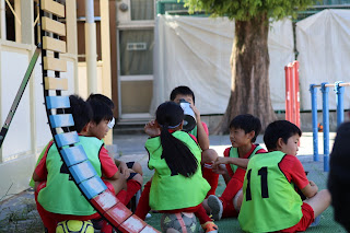 ディフェンスという点では、前から追い回すけんせいとけんのすけ、相手のカウンター攻撃でもダッシュで戻ってきてピンチを防ぐしゅうと、たいき、ひろき、はっさく、危ないスペースを埋めながらサッカーをするゆいとと、だいぶ個性も見えてきて、見ていて楽しかったよ。最後は暑さと疲れで足が止まってしまったり、意図なしキックも多くなってしまったけど、みんなよく頑張りました。